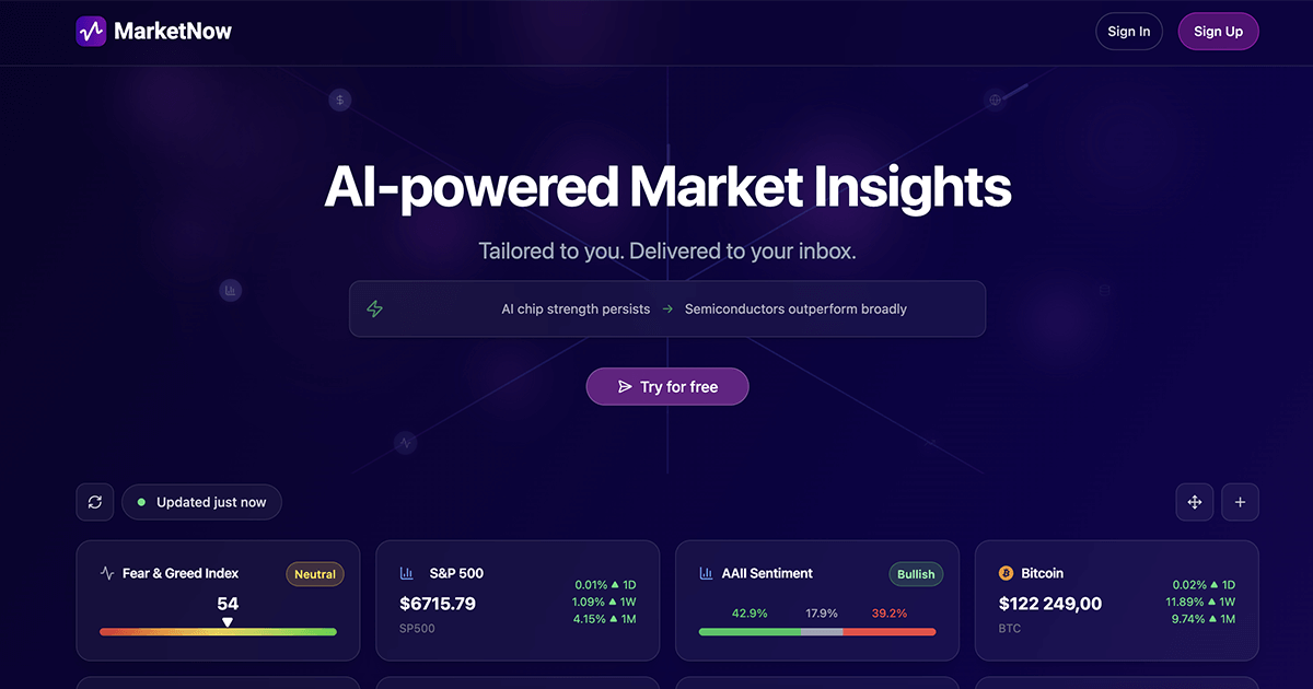 MarketNow.ai delivers comprehensive market analytics through your personalized finance dashboard. Track stocks, crypto monitoring, and economic indicators with real-time financial data. Build your custom investment dashboard with AI-powered market insights, configure subscription preferences, and receive market analytics delivered to your inbox on your schedule—all tailored to your investment portfolio.